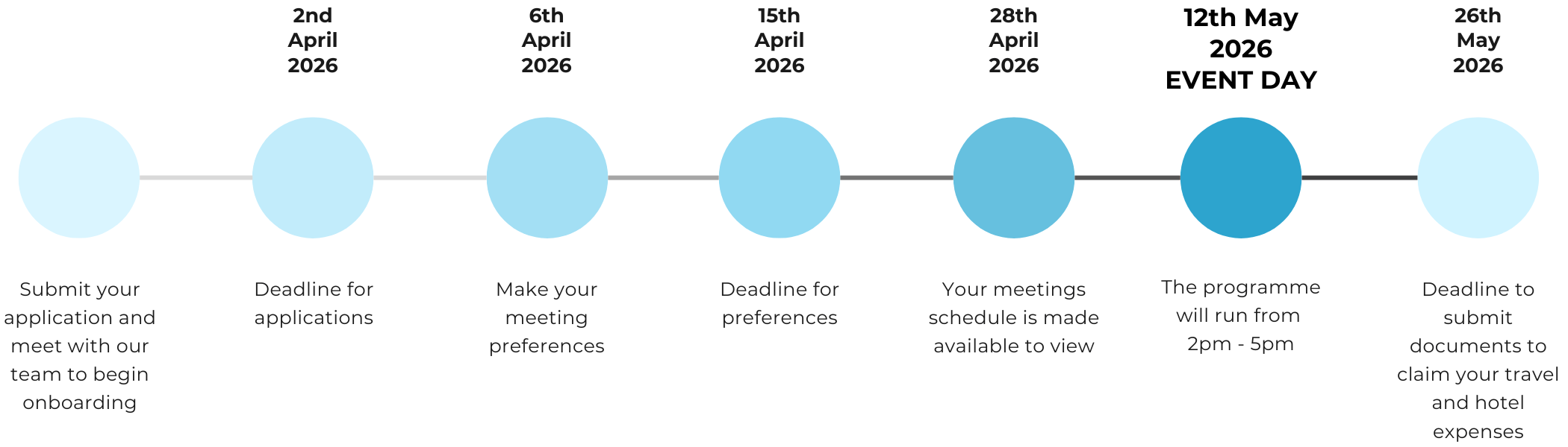The meetings will be 15 minutes long and held between 11am – 12pm and 2pm – 4pm on the event day (13th May 2025) in the VIP hosted meetings lounge.